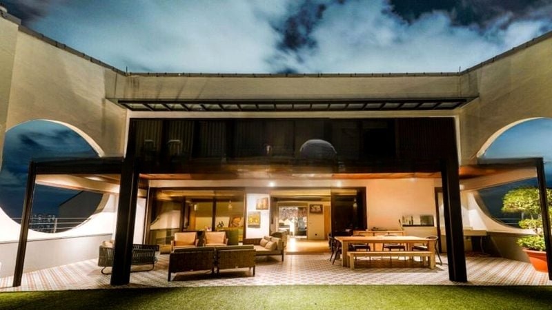 Step into a world of modern elegance, where abundant natural light floods this beautifully renovated unit, highlighting the exquisite designer finishes throughout. The open concept living area features floor-to-ceiling sliding doors that seamlessly connect to a large balcony, offering breathtaking views of lush greenery and the vibrant cityscape beyond. The eclectic ambiance is complemented by exposed wooden ceiling beams and stylish track lighting, creating a warm and inviting atmosphere.