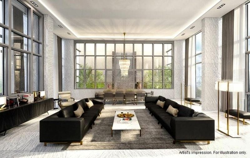 This spacious 4-bedroom, 4-bathroom layout offers a seamless flow between the living, dining, and study areas. Each room is thoughtfully designed, from the cozy twin beds in the bedroom to the sleek white minimalist desk in the study. The fully-furnished unit boasts luxurious touches like a velvet ottoman with a gold base and a round black pedestal dining table, perfect for entertaining guests.