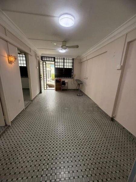 Step into a world of nostalgia as you enter this spacious HDB flat, where original retro patterned floor tiles greet you with a warm embrace. The living area is bathed in moderate natural light, creating an inviting ambiance complemented by a ceiling fan and wall-mounted air conditioning unit. Enjoy views of the neighbouring buildings while relishing the functional layout that offers both comfort and practicality.