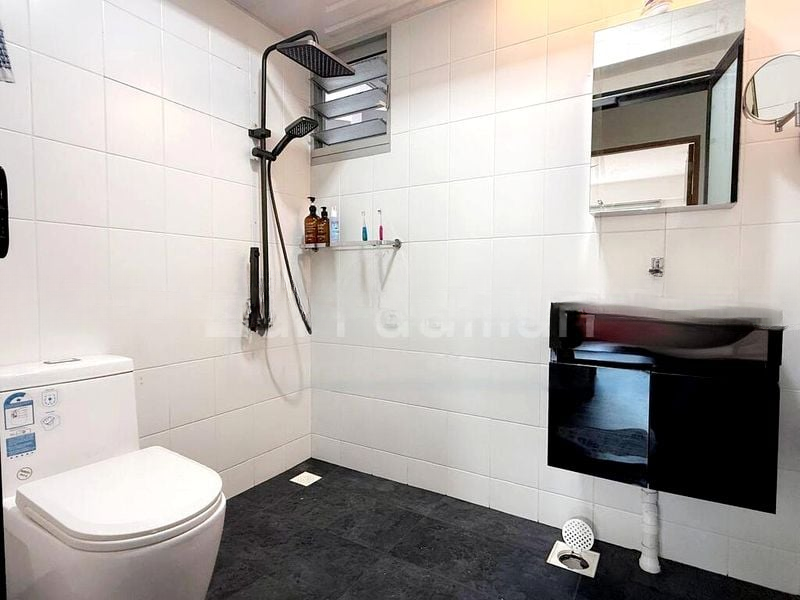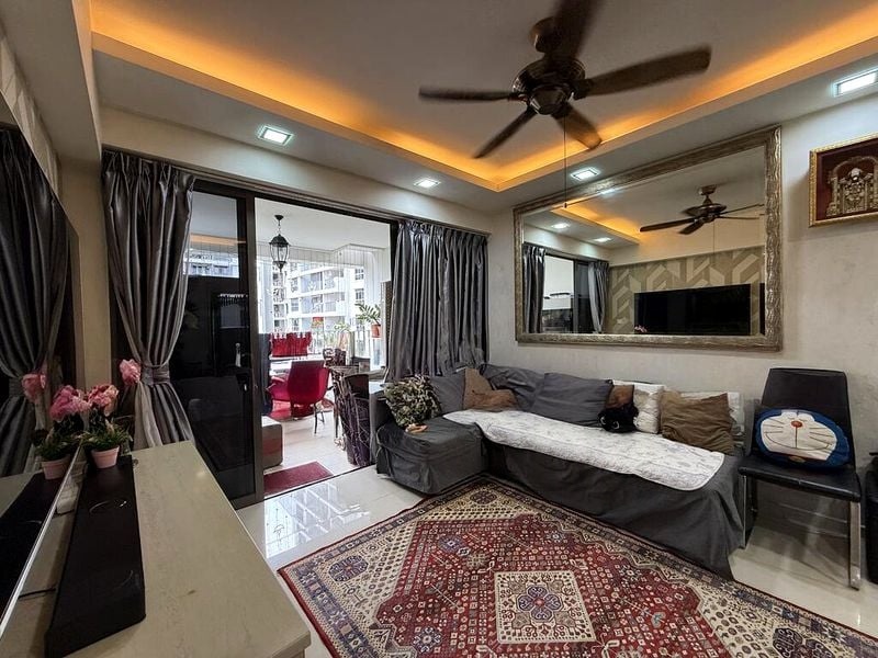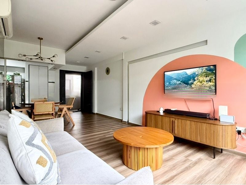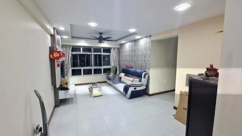 Step into a well-maintained haven where modern living meets comfort. The living room greets you with a stylish false ceiling adorned with recessed downlights, complemented by large windows that invite natural light to dance across the tiled flooring. A patterned feature wall adds character, while the ceiling fan ensures a cool ambiance, making it the perfect space for relaxation or entertaining.