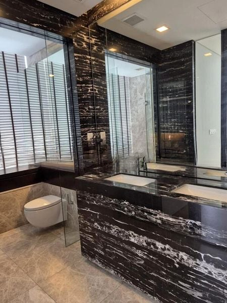 This spacious 4-bedroom, 5-bathroom unit boasts standout features including a large dark stone kitchen island, integrated dark wood cabinetry, and a master bathroom with a double vanity and rain shower. The seamless flow between the living and kitchen areas makes it perfect for entertaining, while the recessed lighting adds a touch of sophistication. Each room is designed with comfort and style in mind, ensuring a refined living experience.