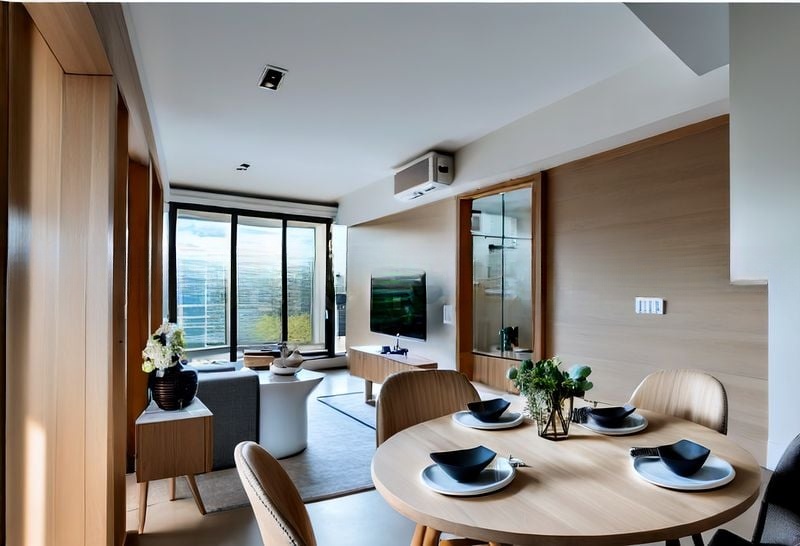 This thoughtfully designed unit features a spacious living room with direct balcony access, perfect for entertaining or relaxing. The L-shaped kitchen boasts wood-grain cabinetry, integrated appliances, and stone countertops, making it a chef's dream. Each bedroom offers comfort with wood-look laminate flooring and built-in wardrobes, while the marble-look bathroom adds a touch of luxury with its elegant finishes and glass shower partition.