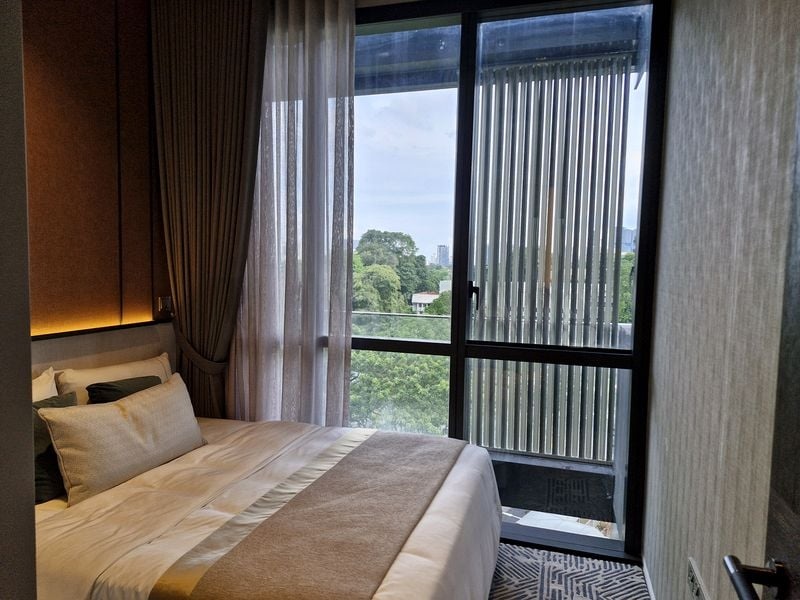 Step into this brand-new designer unit at 19 Nassim and be captivated by the abundant natural light flooding through extensive glass balconies, offering breathtaking views of lush greenery and the cityscape. The modern minimalist ambiance is accentuated by travertine-textured stone walls and a striking architectural facade featuring vertical louvers, creating a serene and stylish environment.