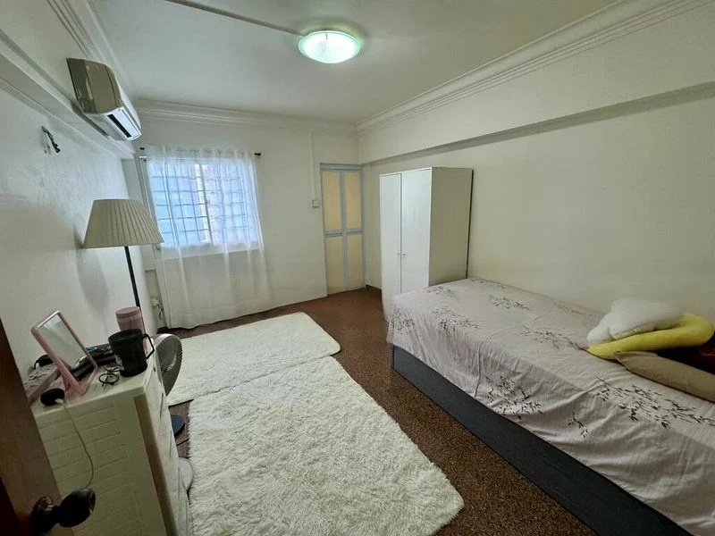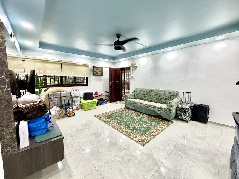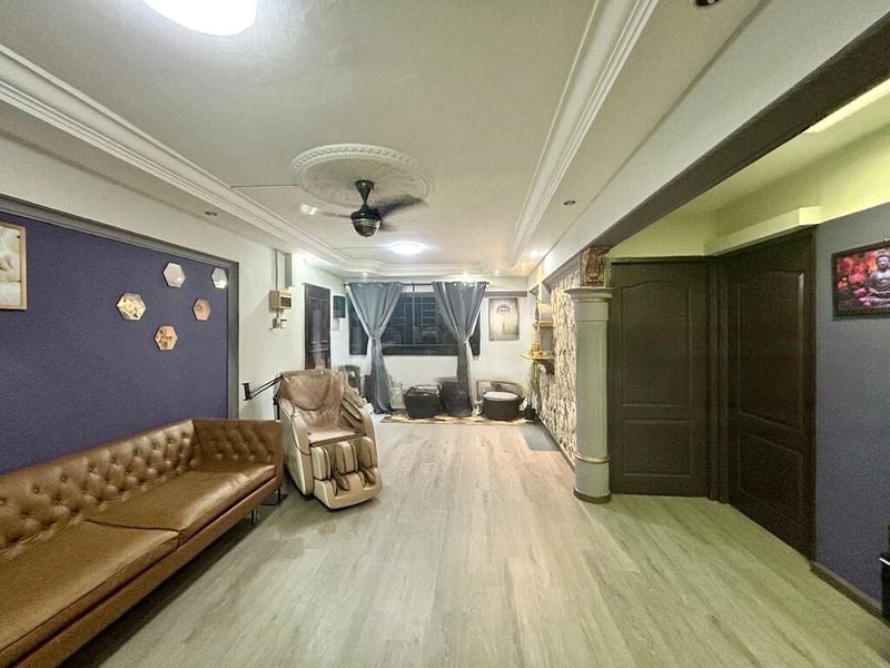 Step into this inviting HDB flat and feel the warmth of traditional charm envelop you. The moderate natural light filters through the blue blackout curtains, enhancing the simple yet elegant ambiance. The arched doorway, framed by decorative tiles, beckons you further into the living space, where a classic wooden sofa set and glass-topped coffee table create a cozy gathering spot.