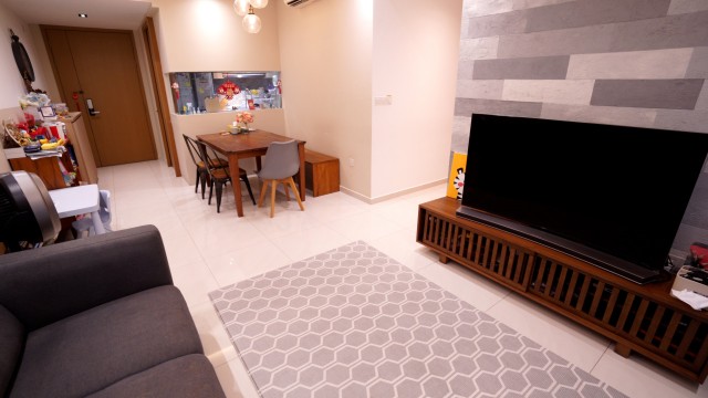 This spacious 4-bedroom unit features standout rooms, including a master bedroom with a calming green accent wall and built-in sliding wardrobes, ensuring ample storage. The dining area boasts a solid wood dining table and a glass viewing window to the kitchen, while the study room offers a compact workspace with a corner window layout. Each bedroom is thoughtfully designed, with unique colour schemes and practical furnishings that cater to both comfort and style.