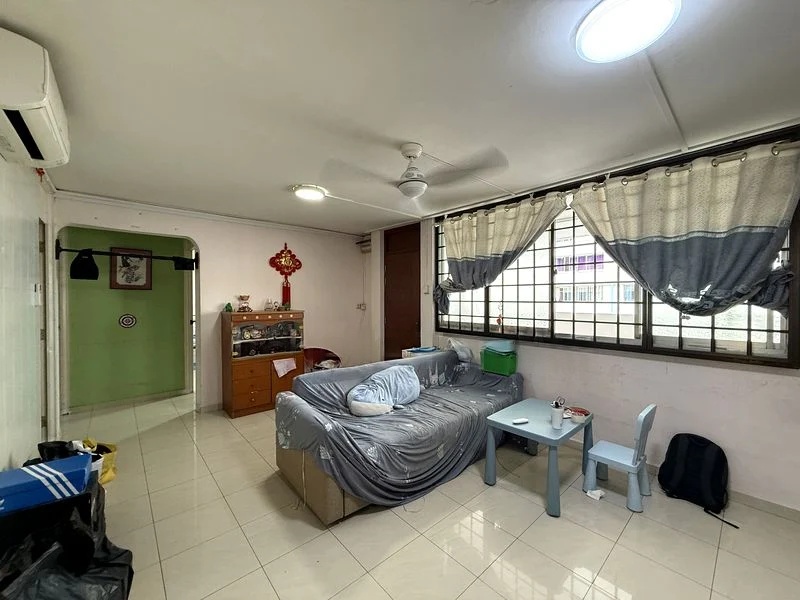 Step into a functional and lived-in space where moderate natural light filters through large windows, illuminating the tiled flooring and creating a warm ambiance. The living room welcomes you with a patterned sofa cover, complemented by split-unit air conditioning and a ceiling fan, making it a comfortable retreat.