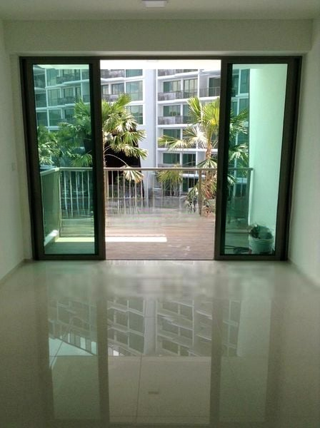 Step into a serene oasis at Ripple Bay, where abundant natural light floods the open-concept living space, accentuating the polished tile flooring and modern minimalist finishes. The inviting ambiance is complemented by an unblocked view of lush greenery from the balcony, creating a perfect backdrop for relaxation.