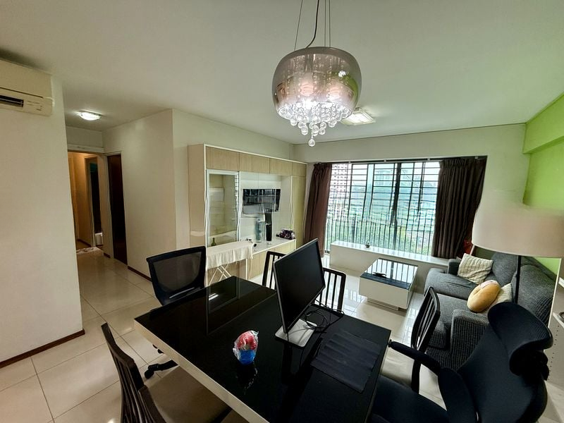 Step into a bright and airy sanctuary where abundant natural light floods through large windows, showcasing unblocked panoramic views of the city skyline and charming heritage shophouses. The modern finishes, including large format floor tiles and designer pendant lights, create an inviting ambiance that makes you feel right at home.