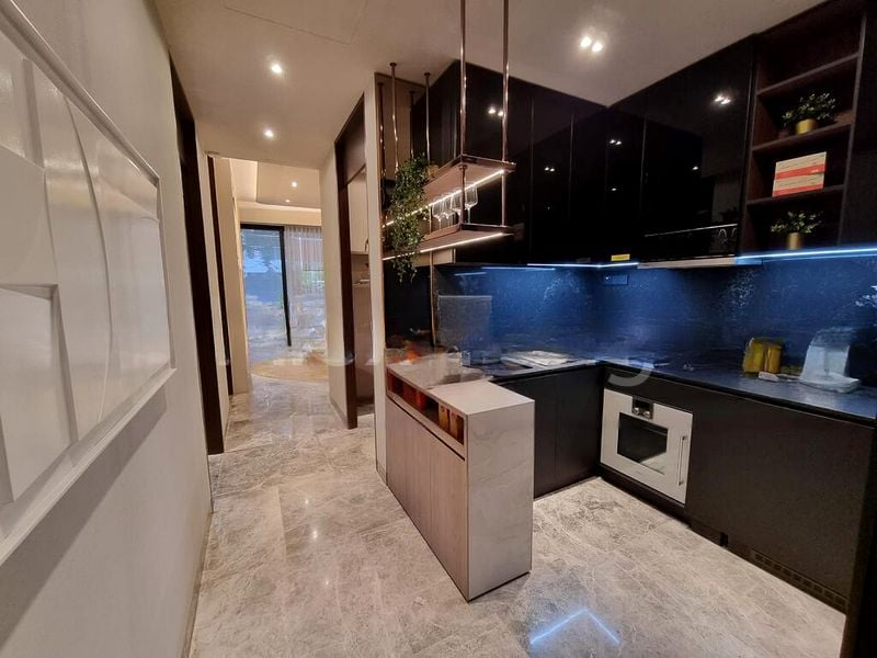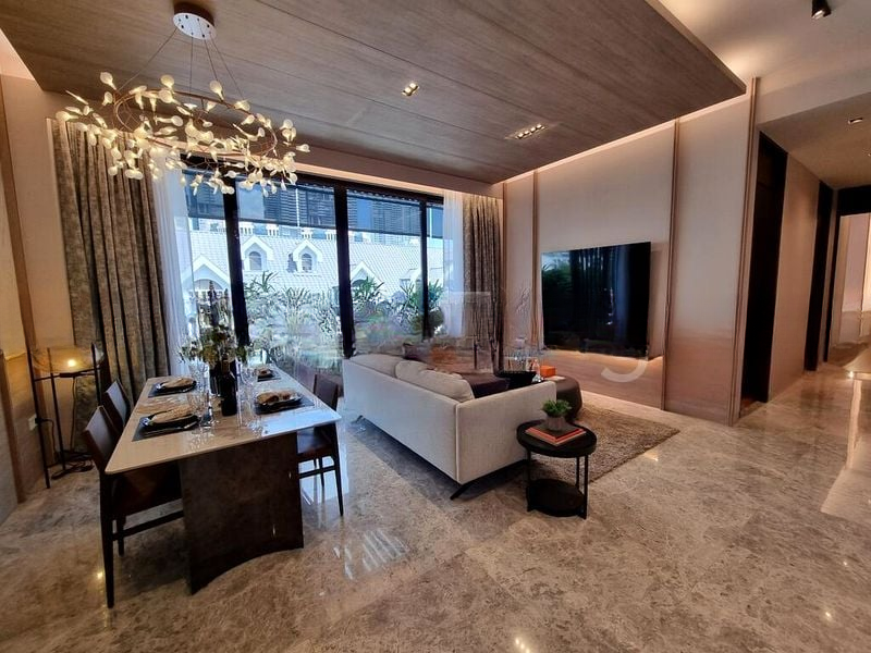 Step into a world of modern luxury as you enter this impeccably designed unit at Jervois Prive. The marble flooring gleams under the natural light filtering through sliding glass doors, creating an inviting ambiance. Enjoy serene views of lush greenery and neighboring buildings from your glass-enclosed balcony, perfect for relaxation or entertaining.