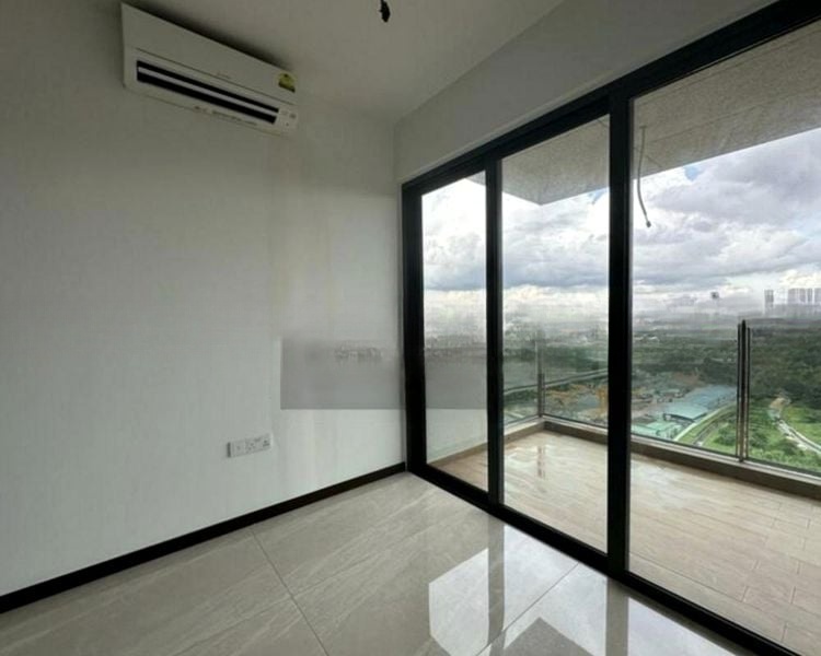 Step into a sanctuary of modern minimalist design where abundant natural light floods the space, highlighting the polished tile flooring and the stunning unblocked views of lush greenery and the city skyline. The airy ambiance invites you to relax and unwind, while the balcony with glass railing offers a perfect vantage point to enjoy the serene surroundings.