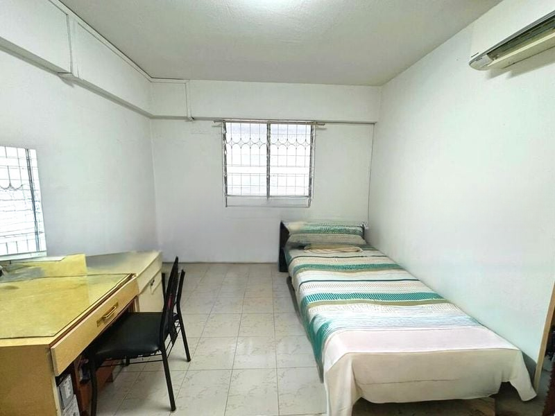 This unit features two well-appointed bedrooms, each equipped with air conditioning for your comfort. The first bedroom boasts a single bed and a spacious vanity desk, perfect for personal grooming or study. The second bedroom offers a double bed with sliding door access, complemented by a dedicated study desk. The bathroom showcases two-tone ceramic wall tiles and is fitted with modern amenities, including an instant water heater and safety grab bars for added convenience.