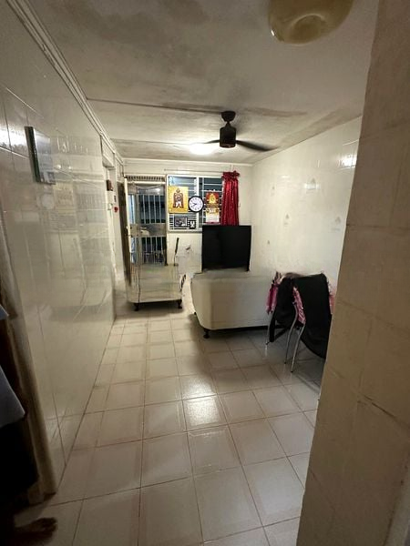Step into a functional living space that embodies simplicity and practicality. The living room greets you with ceramic tile flooring and white tiled walls, creating a clean backdrop for your furnishings. Natural light may be limited, but the ambiance is enhanced by ceiling fans and a comfortable white sofa set, perfect for relaxation after a long day.