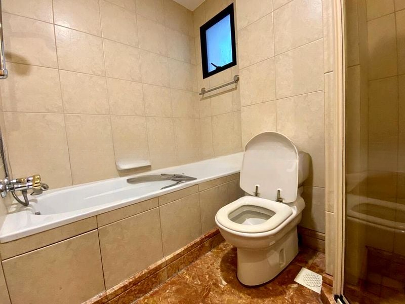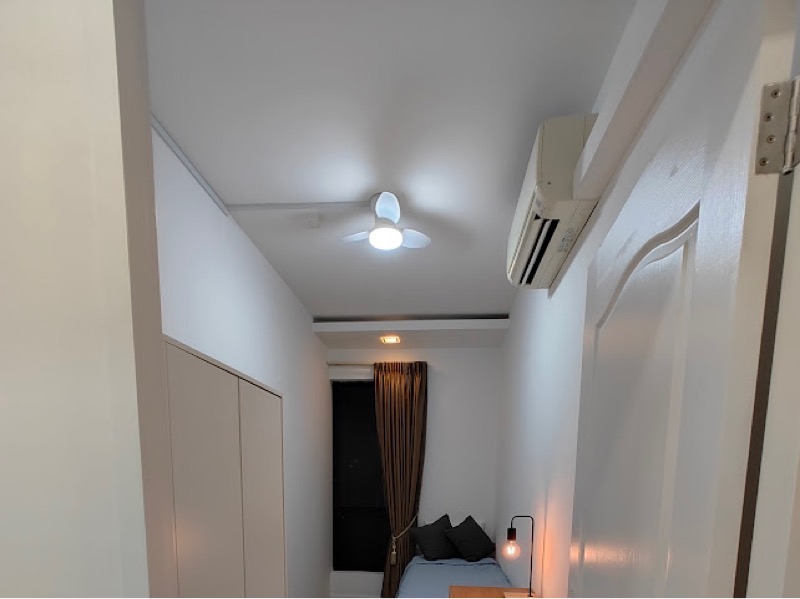 Step into a serene oasis at Heritage View, where modern minimalist design meets functionality. The compact layout of this fully-furnished 1-bedroom unit is accentuated by light-colored tiled flooring and white painted walls, creating an inviting ambiance. The integrated ceiling fan with light and modern Edison bulb desk lamp illuminate the space, while blackout curtains ensure privacy and comfort.