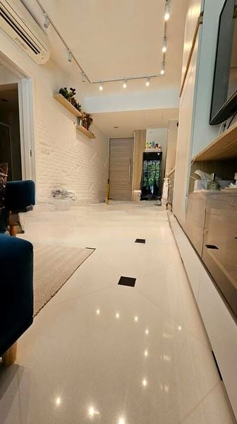 Step into a sanctuary of modern elegance at Sophia Hills, where designer finishes and thoughtful details create an inviting atmosphere. The living room welcomes you with polished floor tiles accented by a striking white brick-textured feature wall, enhanced by track lighting that casts a warm glow. Large windows frame a tranquil view of lush greenery, infusing the space with a refreshing ambiance.