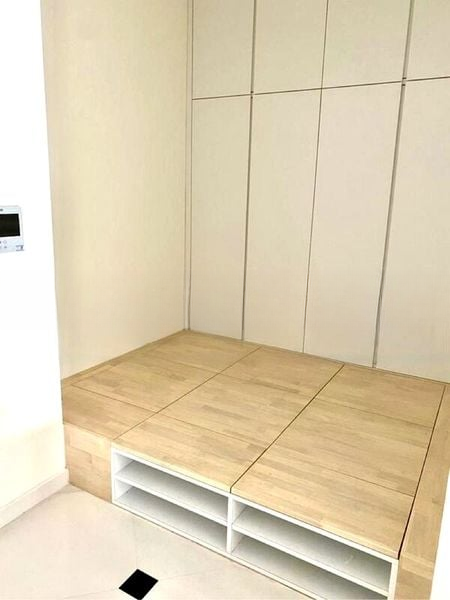 This well-maintained 1-bedroom unit features a seamless layout, highlighted by a stylish bedroom with wood-look flooring and a platform bed that offers integrated storage. The modern bathroom boasts luxurious marble-veined tiles and a sleek glass shower enclosure, ensuring both comfort and sophistication. Built-in cabinetry throughout maximizes space while maintaining the minimalist aesthetic.