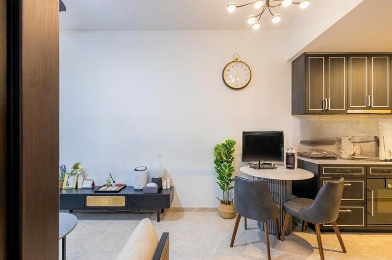 This efficient 1-bedroom layout features an open-concept living and dining area that seamlessly connects to a private balcony, perfect for unwinding after a long day. The designer kitchen boasts integrated appliances and a linear layout, while the bathroom impresses with marble-patterned wall tiles and a rain shower. Enjoy exclusive access to the stunning 50m lap pool and a pool house pavilion, enhancing your lifestyle with resort-like amenities.