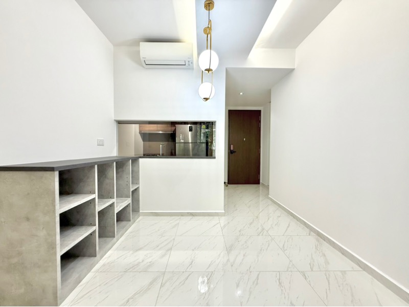 Step into a world of modern elegance as you enter this brand-new 1-bedroom unit at LE QUEST. The abundant natural light floods the open-concept living space, highlighting the stunning marble-look porcelain floor tiles and creating a warm, inviting ambiance. Sliding glass doors lead you to a balcony that offers serene views of lush greenery, perfect for unwinding after a long day.