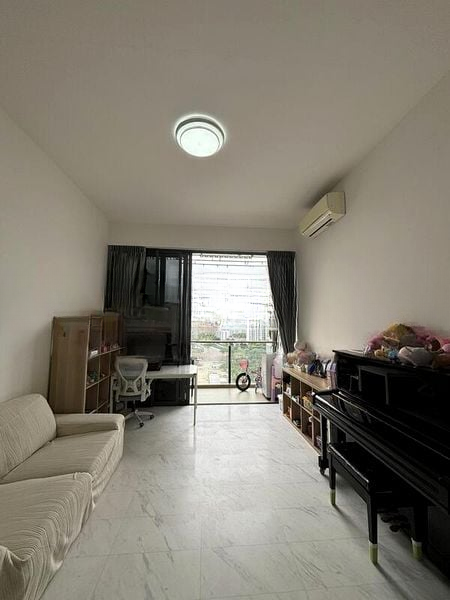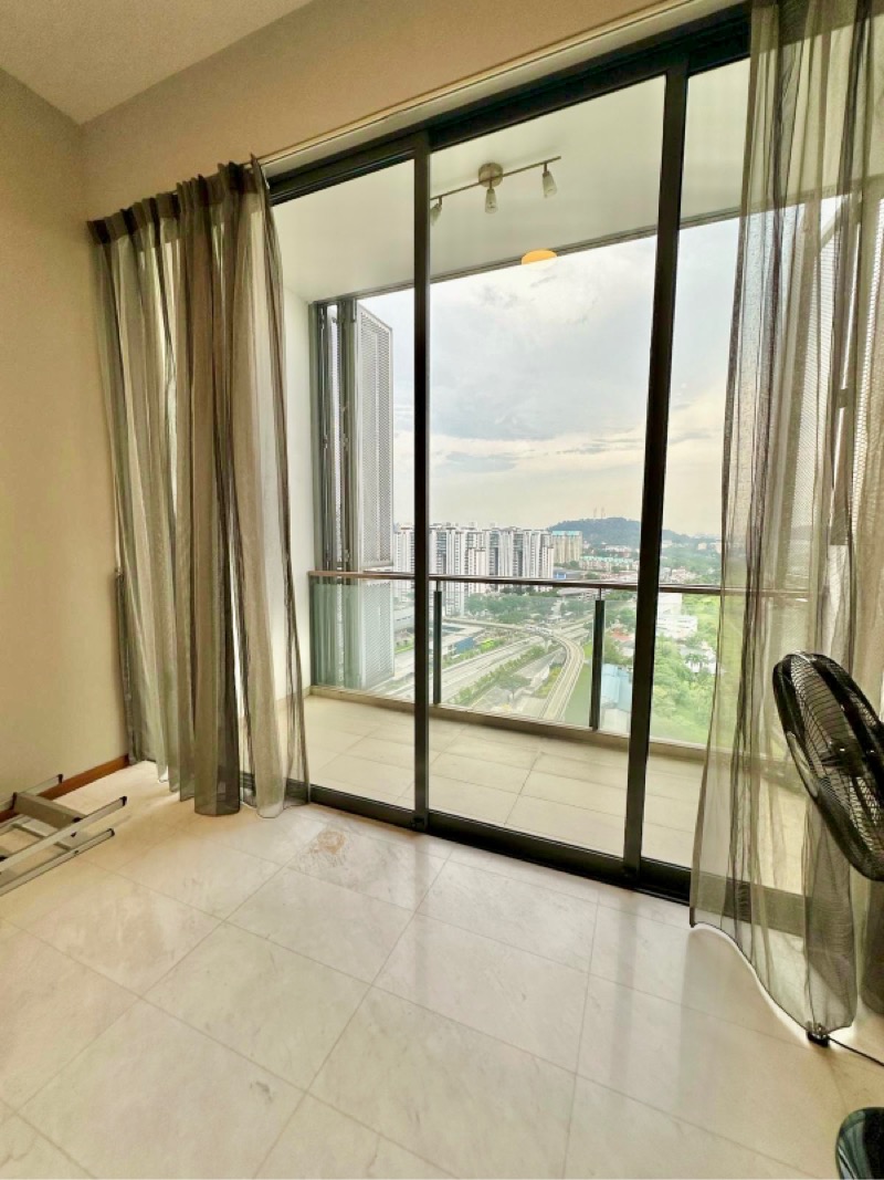 Step into a bright and airy sanctuary where abundant natural light dances across the marble-look floor tiles. The floor-to-ceiling sliding doors invite you to enjoy stunning views of the city skyline and lush greenery, while the unique perforated metal balcony screens add a touch of modern elegance to your outdoor space.
