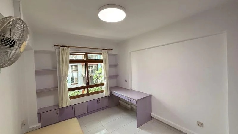 This spacious 3-bedroom flat features extensive built-in wardrobes in all bedrooms, providing ample storage solutions. The kitchen boasts elegant grey granite countertops, complemented by white cabinetry with glass inserts, and is equipped with a stainless steel chimney hood and gas cooktop. Each bedroom is thoughtfully designed with integrated study desks and window seat storage, ensuring both comfort and practicality.