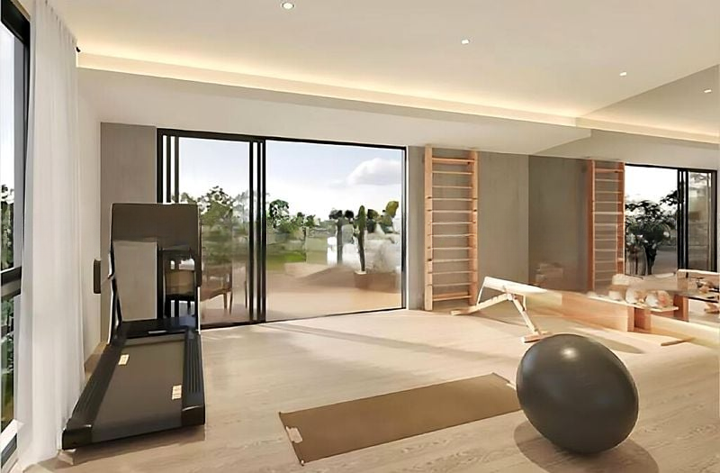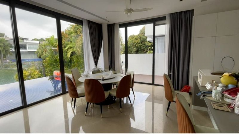 The spacious layout features a stunning double-volume ceiling and a modern glass and metal staircase that leads to five beautifully appointed bedrooms and five luxurious bathrooms. The dining area boasts a round marble table with designer chairs, while the living area invites relaxation with its dark grey tufted leather sofa and green velvet armchairs. A unique tea room/study with a slanted ceiling and large-scale mural adds an artistic touch, perfect for quiet moments or entertaining guests.