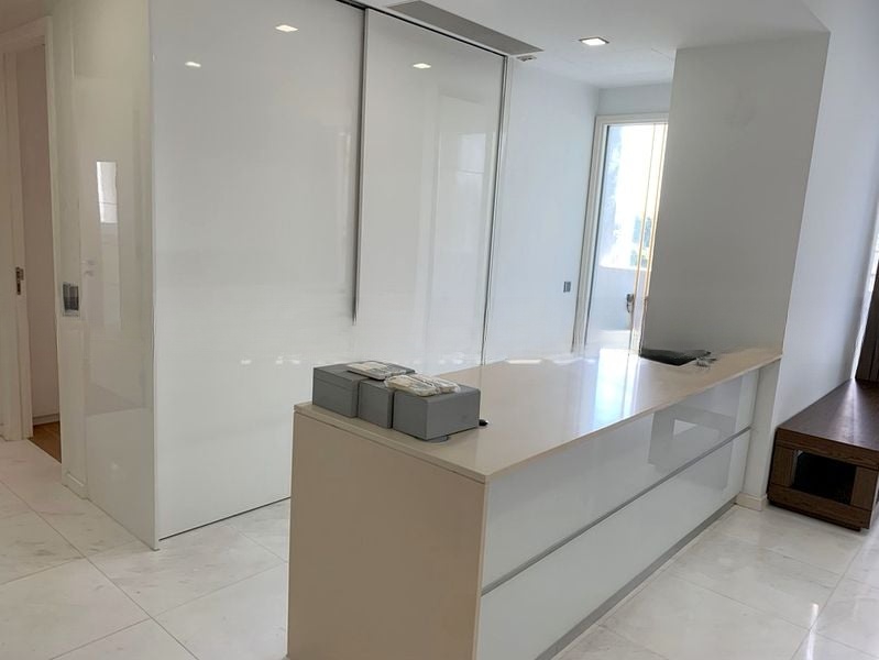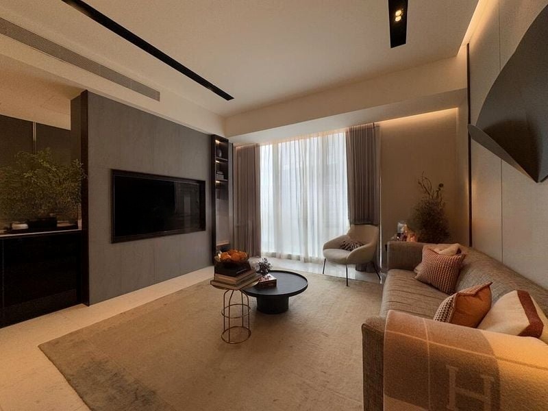 This well-maintained, fully-furnished condominium features an open-concept living room that seamlessly flows into a modern kitchen, complete with an integrated island and breakfast bar. The master bedroom offers a tranquil escape with light wood flooring and a large window, while the additional bedrooms are thoughtfully designed with ample study space and unique features like floor-to-ceiling corner windows. The elegant bathroom boasts marble-look tiles and a wall-hung toilet, adding a touch of luxury to everyday living.