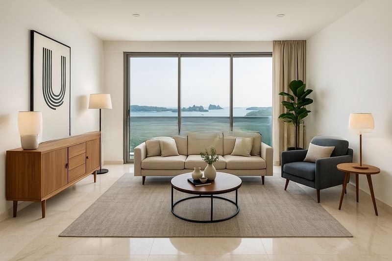 Step into a world of elegance and tranquility as you enter this stunning unit at Reflections at Keppel Bay. The abundant natural light floods the open-concept living and dining area, accentuating the sleek white tile flooring and designer finishes. Floor-to-ceiling glass doors lead to a dark wood-decked balcony, where panoramic views of the waterway and lush greenery create a serene backdrop for your daily life.