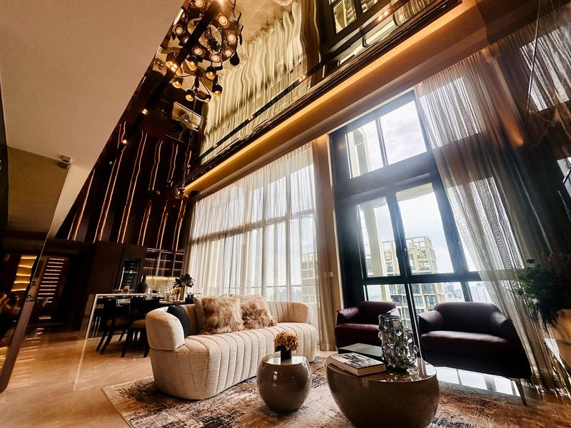 Step into a world of sophistication as you enter this brand-new designer unit at Irwell Hill Residences. The abundant natural light floods through the floor-to-ceiling windows, illuminating the plush white sofa and velvet armchairs in the double-volume living area. A mirrored ceiling adds an extra touch of elegance, while the breathtaking views of the pool, greenery, and city skyline create an ambiance that is both luxurious and inviting.