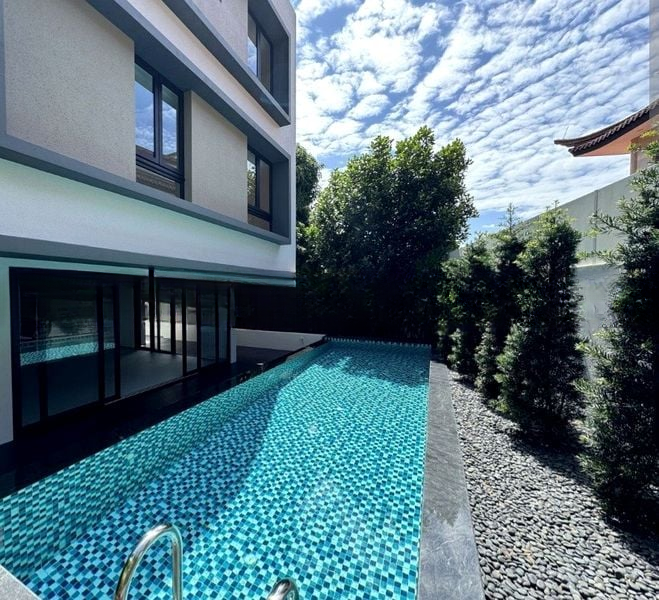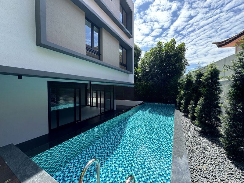Step into a world of luxury as you enter this brand-new home, where abundant natural light floods the bright and airy living spaces. The polished wood flooring and marble-look tiling create an elegant ambiance, while floor-to-ceiling glass doors frame picturesque views of the private swimming pool and lush greenery, inviting the outdoors in.