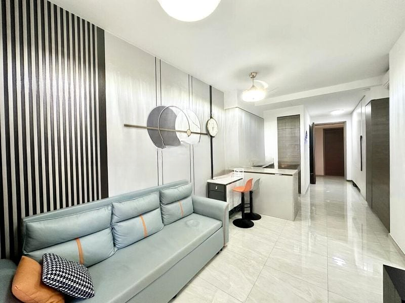 This efficient 2-bedroom, 2-bathroom layout features standout elements such as integrated LED headboard lighting in the master bedroom, custom built-in cabinetry with gold accents, and elegant marble-pattern feature walls. Enjoy the convenience of an enclosed kitchen and a balcony that extends your living space outdoors, perfect for relaxation amidst the landscaped greenery.