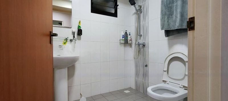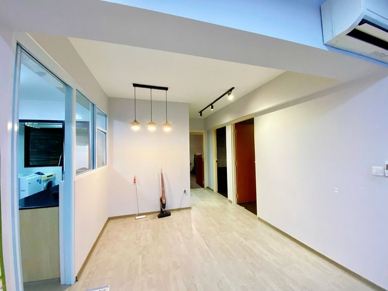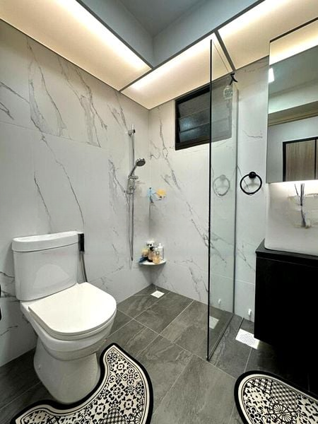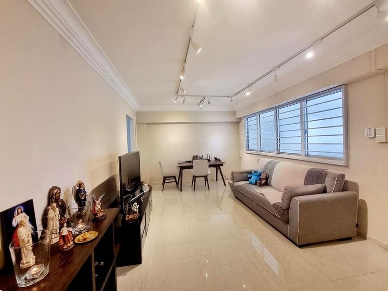 Step into a world of modern elegance as you enter this beautifully renovated HDB flat at 389 Yishun Ave 6. The open-plan living area greets you with large windows that invite natural light, highlighting the sleek tiled flooring and consistent track lighting that runs throughout the space. The ambiance is both inviting and sophisticated, perfect for relaxation or entertaining guests.