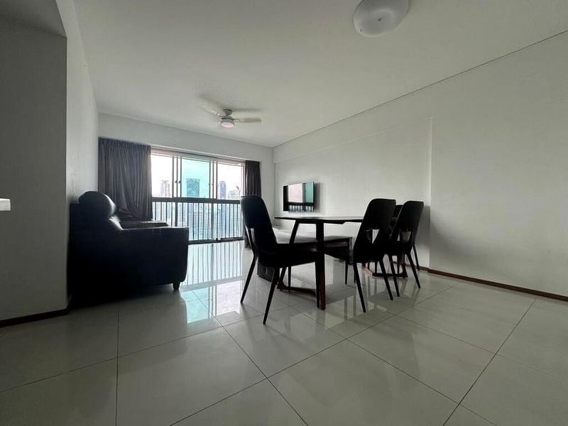 Step into this beautifully renovated HDB unit and be greeted by a modern ambiance that exudes sophistication. The custom tufted wall panels and cove lighting in the dining room create an inviting atmosphere, while large windows offer a stunning city view, filling the space with natural light.