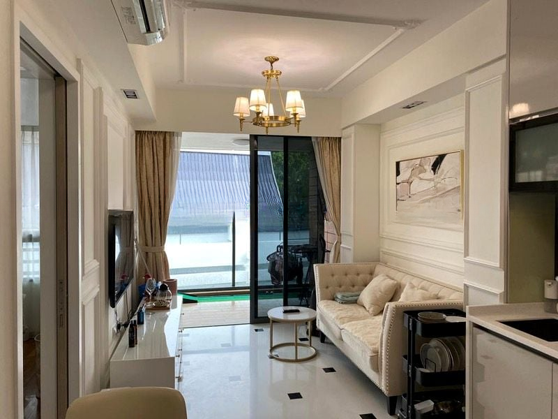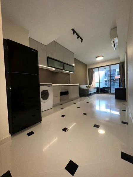 Step into a world of modern elegance as you enter this beautifully renovated 1-bedroom unit at Sophia Hills. The open-concept living room greets you with stunning black and white tiled flooring, complemented by geometric pendant lights that cast a warm glow. Enjoy the serene views of lush greenery from the balcony, creating a peaceful ambiance that invites relaxation.