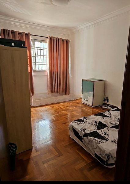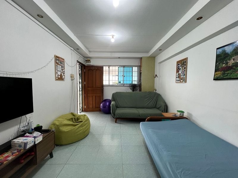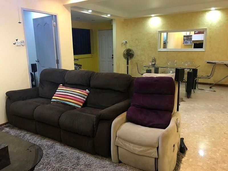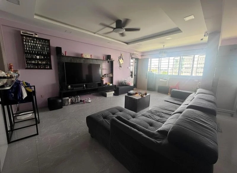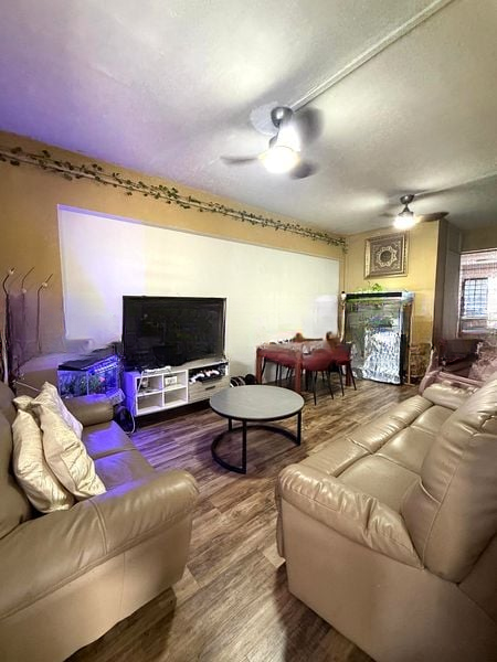 Step into this inviting 4-bedroom HDB flat where warmth and comfort greet you at every turn. The living room boasts a plush grey rug and a dark brown sofa, enhanced by recessed lighting and a ceiling fan that creates a cozy ambiance. The built-in TV console adds a touch of modern elegance, while the large wall mirror in the dining area reflects light and space, making the entire area feel open and welcoming.