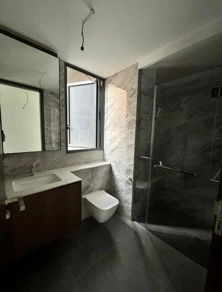 This efficient 3-bedroom, 2-bathroom layout features standout elements such as a dedicated galley kitchen with black stone countertops and integrated appliances, perfect for culinary enthusiasts. The master bedroom boasts wood-look laminate flooring and an en-suite bathroom, while the common bedrooms provide floor-to-ceiling windows and balcony access in one. Luxurious bathrooms are equipped with rain showers, wall-hung toilets, and marble-patterned tiles, ensuring a touch of sophistication.