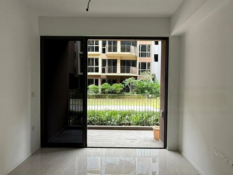 Step into this brand-new, modern minimalist unit where abundant natural light floods the high-ceilinged living area, creating an inviting ambiance. The glossy large-format floor tiles reflect the elegance of the space, while sliding glass doors open to a private balcony, offering serene views of the low-rise residential neighborhood.