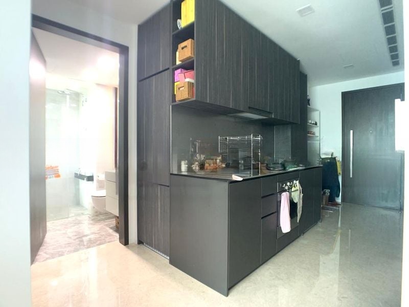 This well-maintained 1-bedroom unit features a spacious layout with a fully-equipped kitchen boasting dark wood-grain cabinetry and integrated appliances. The luxurious bathroom showcases marble-patterned wall tiles and a walk-in shower, while the bedroom offers a serene retreat with dark wood flooring and a large window adorned with elegant purple curtains. Enjoy the impressive amenities, including a large swimming pool with two-tone tiling and a covered outdoor BBQ and dining deck, perfect for entertaining.