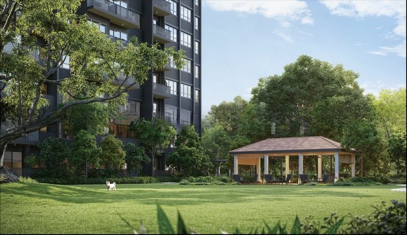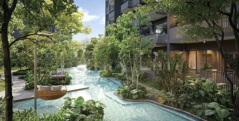This brand-new, fully-furnished unit features five spacious bedrooms and four bathrooms, thoughtfully designed for modern living. The standout rooms include a dedicated co-working space with glass partitions and integrated lighting, perfect for productivity. Step outside to your private balcony with wooden decking, ideal for relaxation while overlooking the central lawn. Enjoy the lagoon-style swimming pool, complete with hanging chairs, and a modern clubhouse that boasts a heritage-style tiled roof, all surrounded by tropical landscaping.
