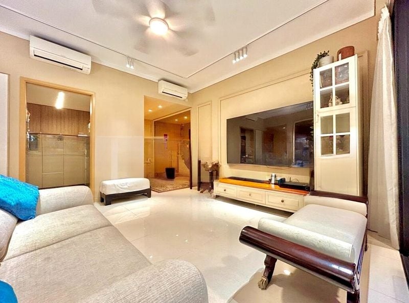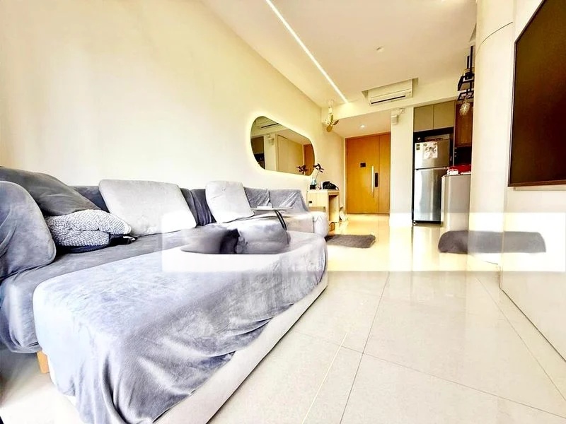 Step into a sanctuary of modern minimalist design at The Jovell, where abundant natural light floods the spacious living area, accentuating the exquisite wood-slat TV feature wall and sleek linear LED ceiling lighting. The inviting ambiance is complemented by a balcony that beckons you to enjoy serene views of lush greenery and neighboring buildings, creating a perfect backdrop for relaxation.