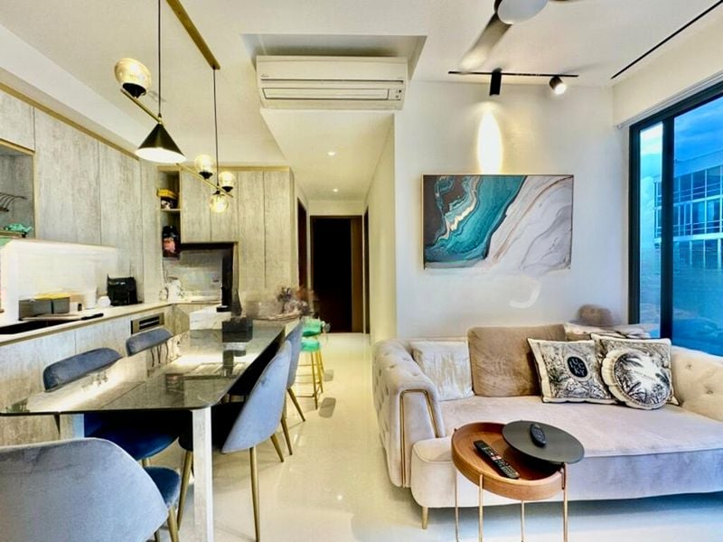 Step into a modern sanctuary at 38 I SUITES, where the ambiance is both inviting and functional. The limited natural light creates a cozy atmosphere, while the views of the city skyline and lap pool from your living space add a touch of elegance to everyday living.