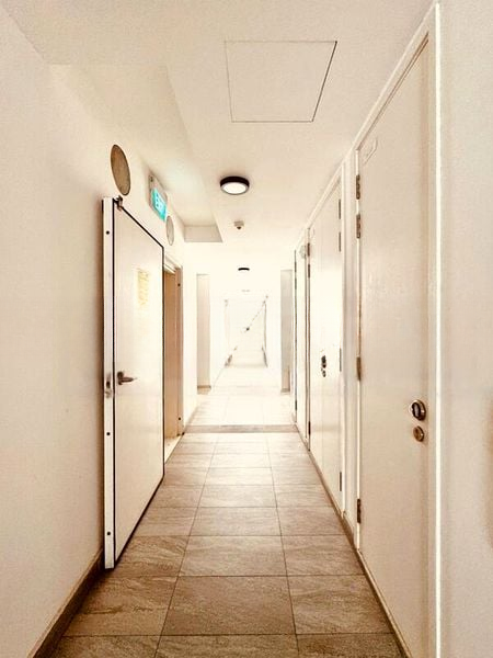 This well-maintained unit features a thoughtful layout with a spacious living area that seamlessly connects to an integrated kitchen equipped with modern appliances, including an induction hob and built-in oven. The bathroom boasts a luxurious walk-in shower and contemporary vanity, while the bedrooms offer large windows and built-in desks, perfect for work-from-home arrangements. With wood-look flooring throughout, this home exudes warmth and style.