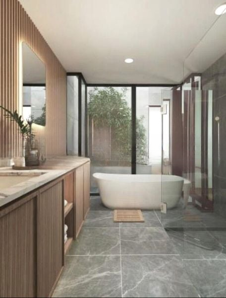 This spacious 5-bedroom, 4-bathroom unit boasts a double-volume ceiling in the living room, enhancing the open-concept layout that seamlessly connects the living, dining, and kitchen areas. The kitchen is a chef's dream with its black marble island countertop and integrated induction hob, while the luxurious bathrooms feature a freestanding bathtub and double vanity with elegant wood cabinetry. Enjoy outdoor living on the balcony, complete with a wood-slat pergola and privacy screen, perfect for entertaining or relaxing.