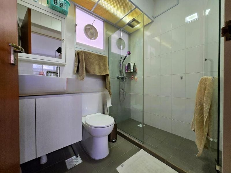 This efficient 3-room layout features two comfortable bedrooms, including a master suite with a dark wood sliding wardrobe and cove lighting that adds a touch of elegance. The kitchen is a chef's delight, boasting black quartz countertops, wood-grain upper cabinets, and a gas hob, while the integrated service yard provides convenience with a dedicated laundry area. Enjoy the ease of access to nearby commercial shops and eateries, all just steps away from your doorstep.