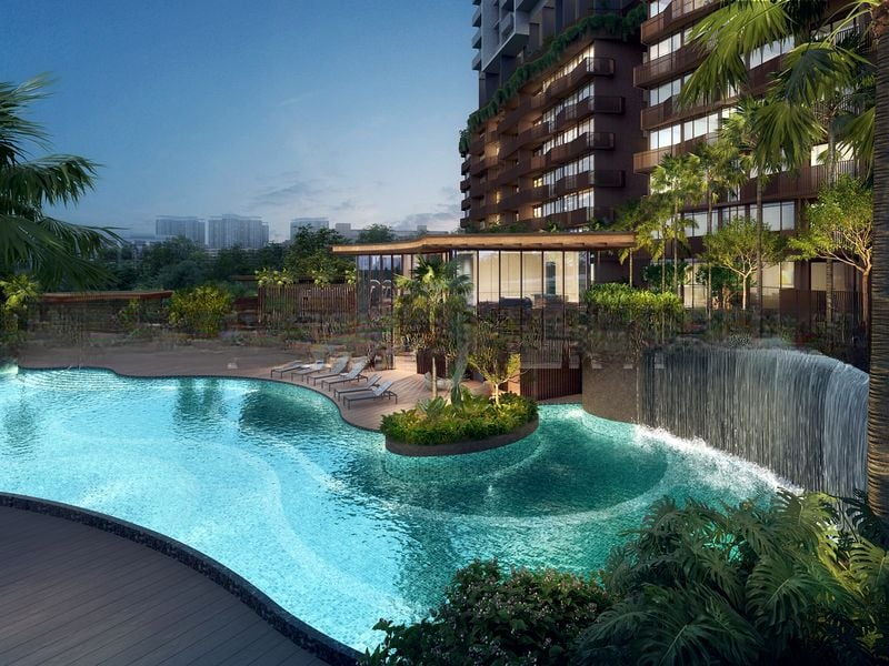 This efficient 1-bedroom plus study layout boasts standout features such as a linear kitchen equipped with integrated appliances, quartz countertops, and wood-grain upper cabinets. The living area seamlessly connects to the balcony, while the luxurious bathroom and private jacuzzi area elevate your living experience. Enjoy the infinity-style pool and the serene sound of the man-made waterfall from the poolside pavilion, enhancing your lifestyle in this tropical oasis.