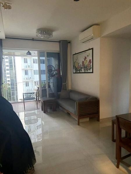 Step into a warm and inviting atmosphere where natural light dances across the cozy interiors of this well-maintained 3-bedroom unit. The living room, adorned with a stylish grey sofa and a decorative crystal-style ceiling light, seamlessly connects to a private balcony that offers serene views of the swimming pool and lush greenery, creating a perfect retreat for relaxation.