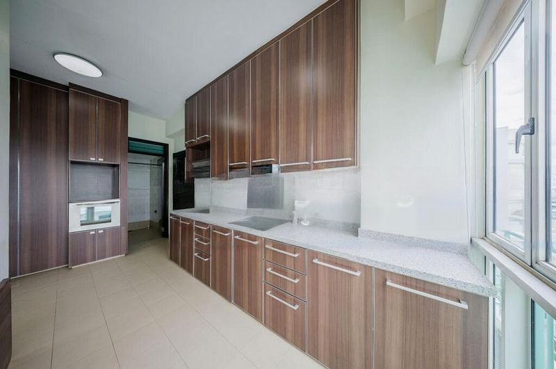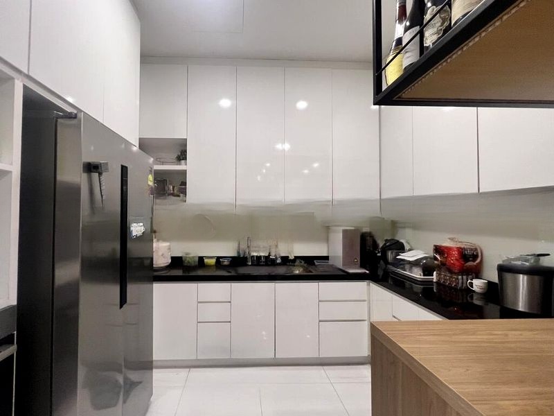 This well-maintained unit features three spacious bedrooms, each showcasing wooden flooring and ceiling fans for a touch of elegance. The master bedroom boasts a four-poster bed frame and built-in wardrobes, while the second bedroom includes an integrated study desk. The bathrooms are thoughtfully designed with a glass shower partition and a rain shower, complemented by modern finishes that enhance the overall appeal of the space.