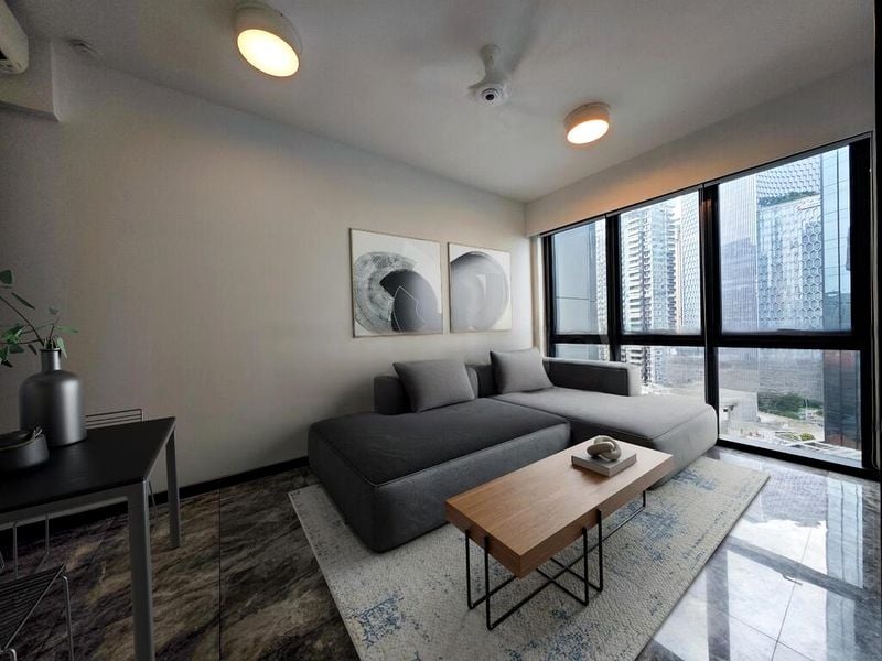 Step into a world of elegance and sophistication as you enter this beautifully renovated unit at South Beach Residences. Bathed in abundant natural light, the open-concept living and dining area features exquisite marble flooring and floor-to-ceiling windows that frame breathtaking city skyline views. The modern minimalist ambiance is enhanced by designer pendant lighting, creating a perfect setting for relaxation or entertaining.