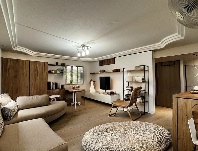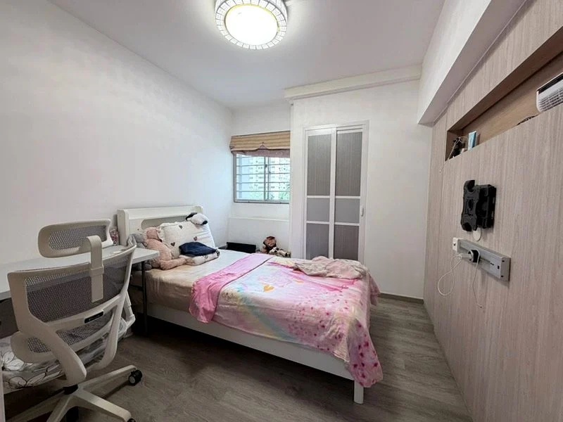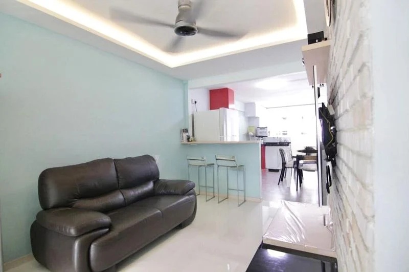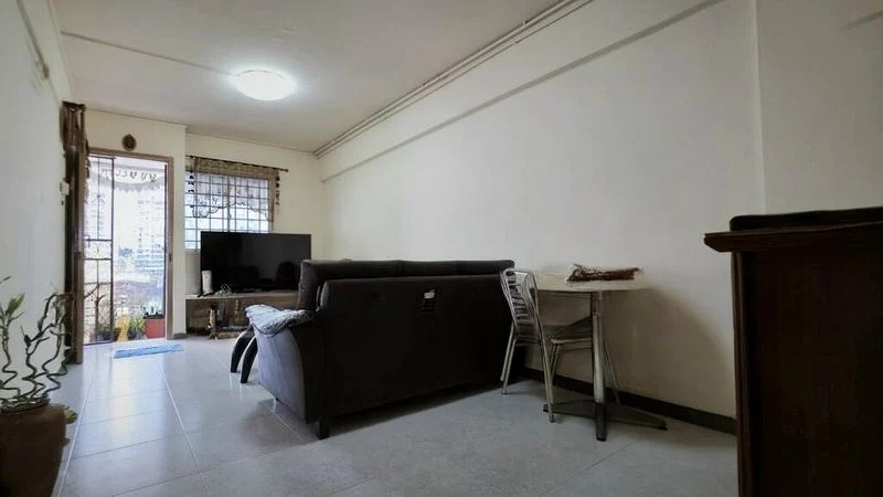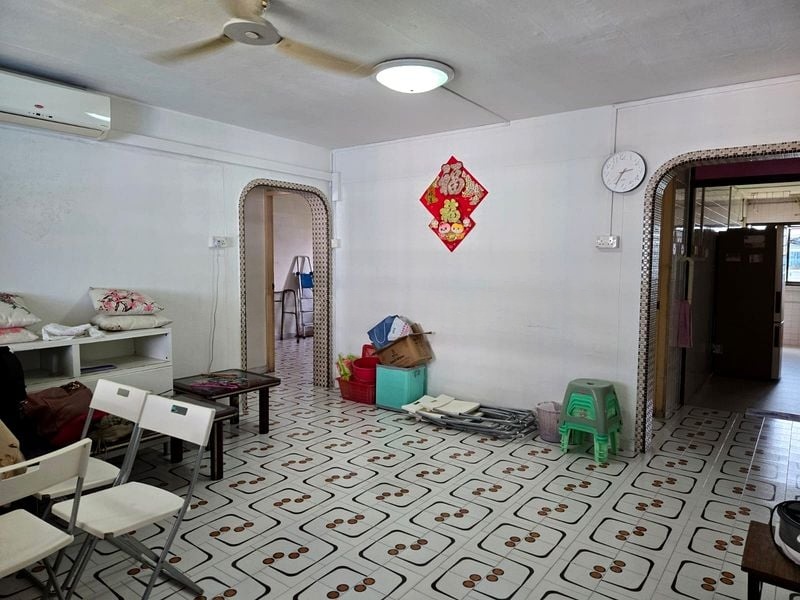 Step into a home that exudes warmth and character, where traditional charm meets functional living. The living room welcomes you with its classic patterned ceramic floor tiles and arched doorways, creating a cozy atmosphere. Natural light filters through the windows, offering views of neighboring greenery and HDB blocks, enhancing the inviting ambiance.