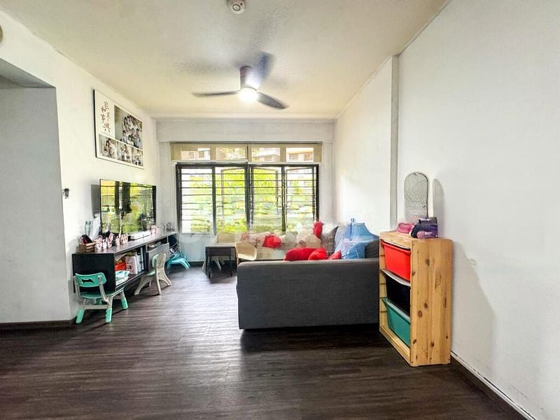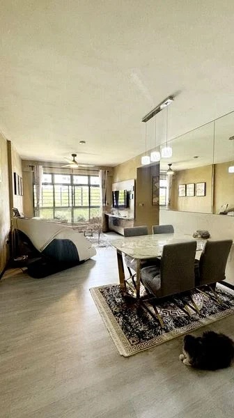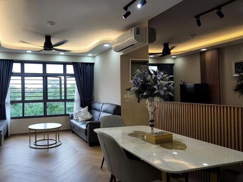 Step into this beautifully renovated 3-bedroom flat and be greeted by a warm ambiance that envelops you. The open-concept living and dining area is bathed in natural light, accentuated by large windows and a stunning chandelier ceiling fan. Vibrant feature walls and built-in display cabinets create a cozy yet stylish atmosphere, perfect for both relaxation and entertaining.
