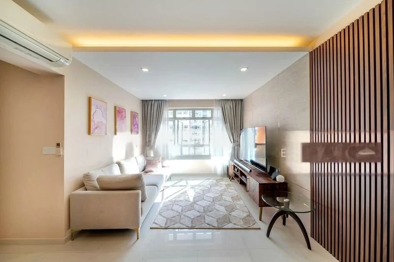 Step into this beautifully renovated HDB flat and be captivated by the abundant natural light that floods the open-concept living and dining area. The modern minimalist ambiance is accentuated by a stunning wooden slat feature wall and designer pendant lighting, creating a warm and inviting space perfect for relaxation and entertaining.