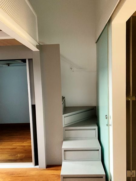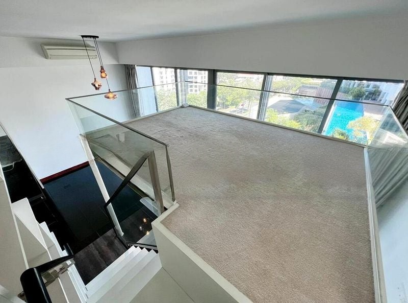 Step into a sanctuary of modern minimalism, where abundant natural light floods the open-concept living space, highlighting the sleek marble-look flooring and stylish finishes. The loft bed with a glass railing creates an airy ambiance, while the sliding glass doors lead to a balcony that offers unobstructed views of lush greenery, inviting serenity into your daily life.
